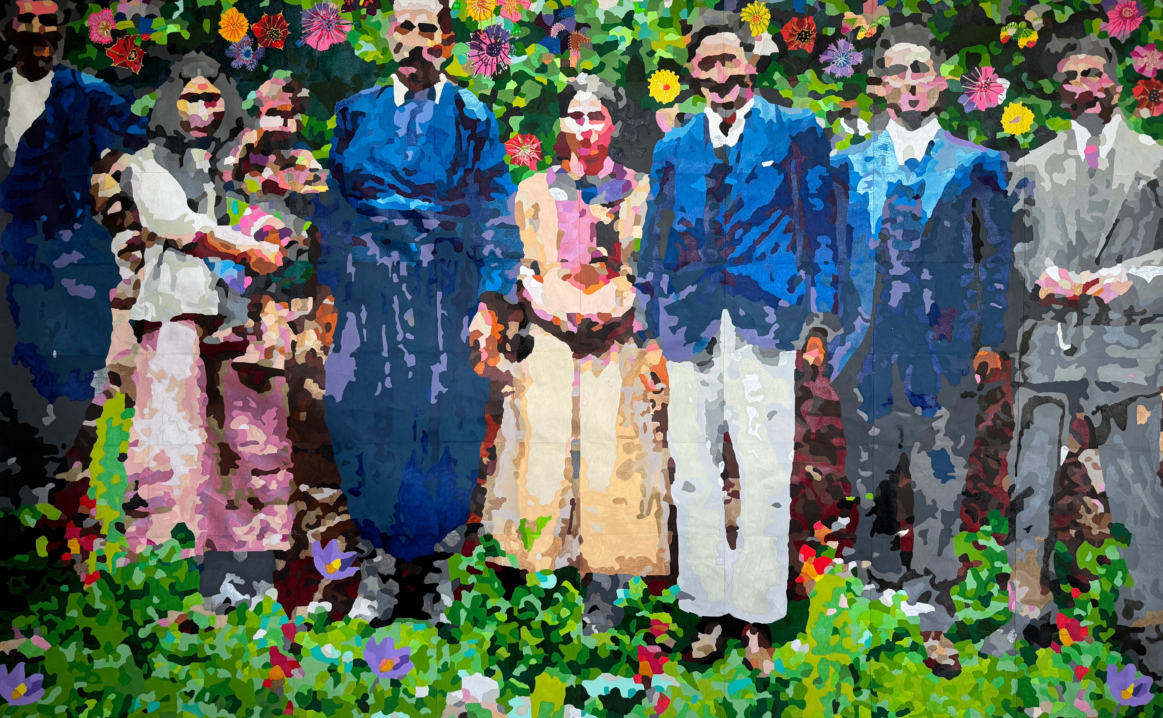 The work consists of 64 individually painted, unstretched canvas panels joined to form a single painting.