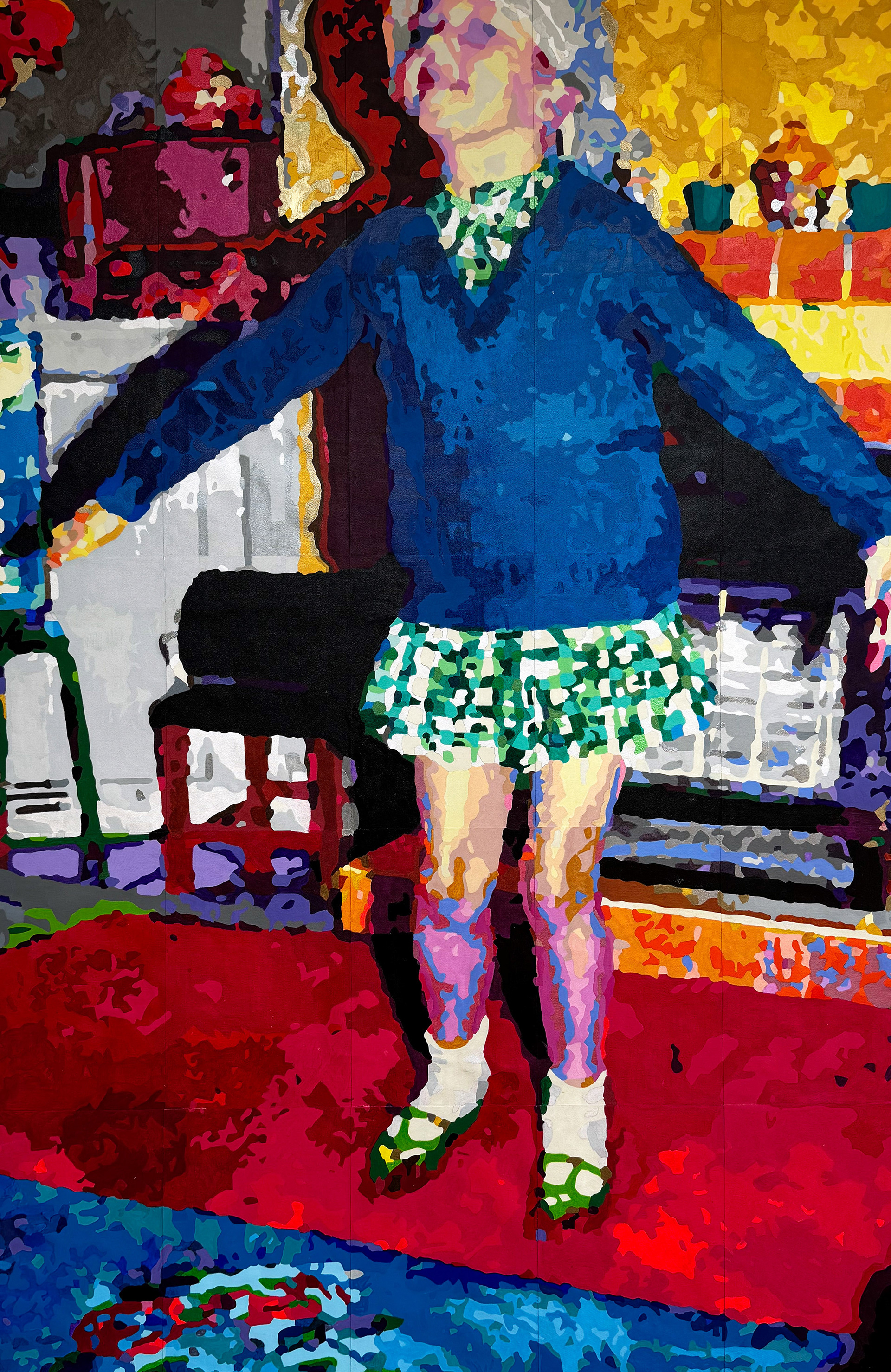 The work consists of 25 individually painted, unstretched canvas panels mounted on a stretched canvas.