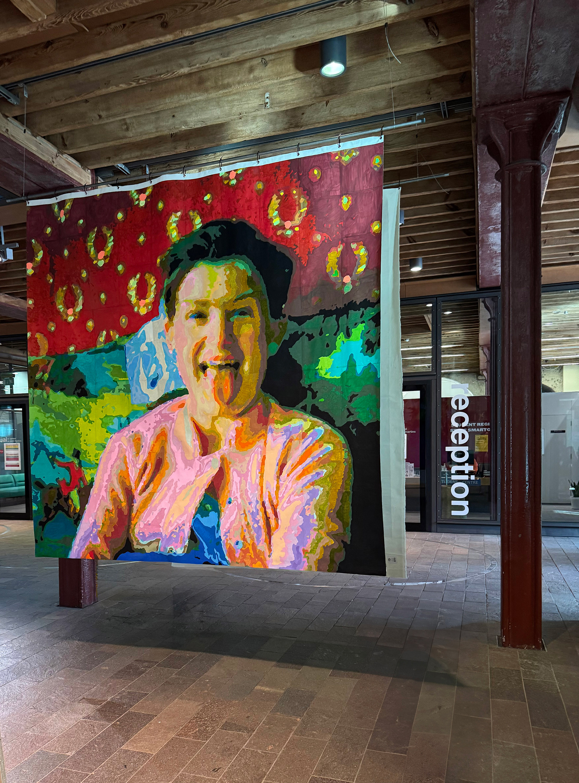 The work consists of 100 individually painted, unstretched canvas panels joined to form a single painting.
